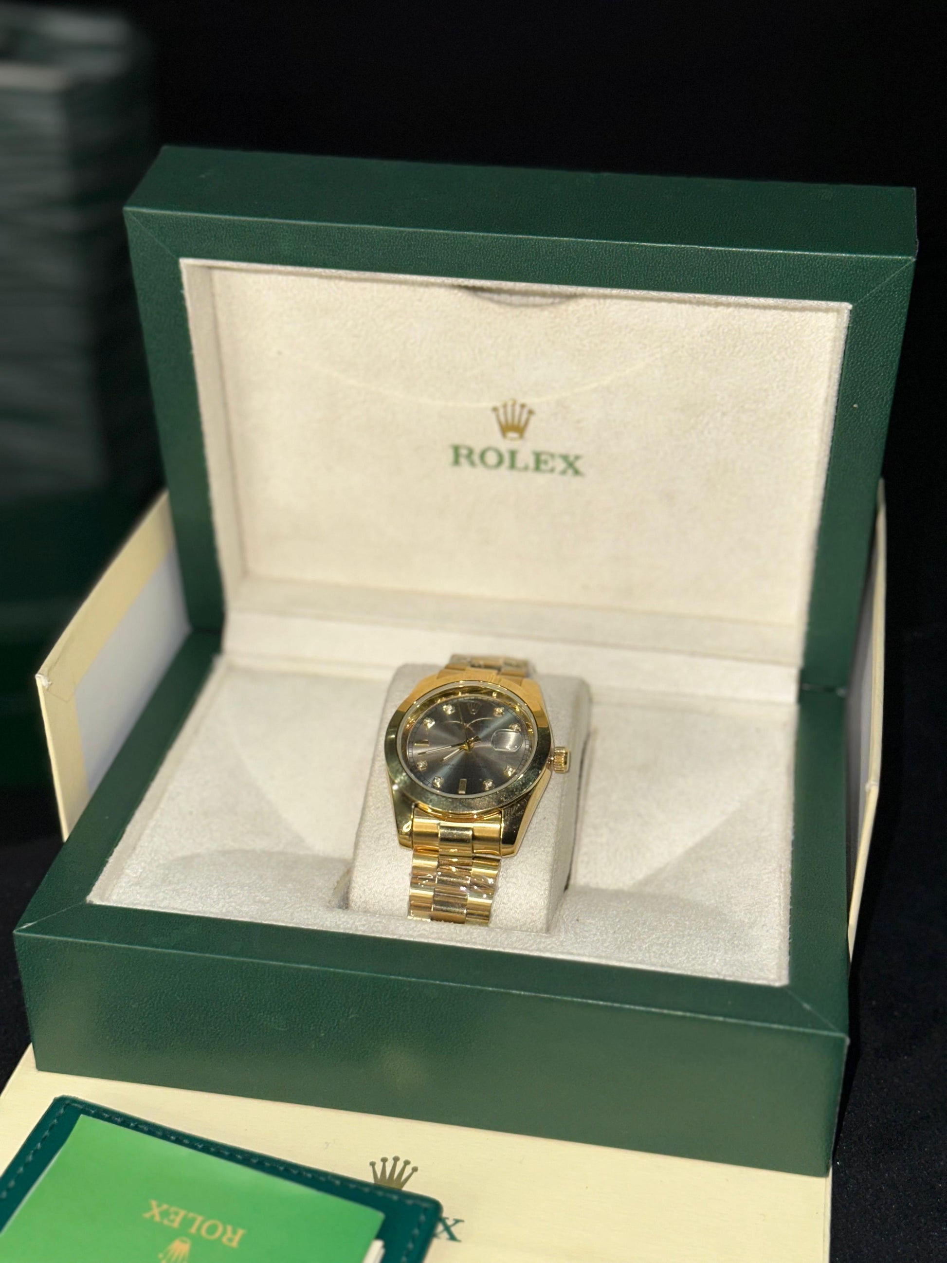 Turn every moment into a statement with the Rolex Datejust Two-Tone Silver Diamond Edition, a symbol of refined success and timeless elegance. Featuring a sunburst silver dial adorned with diamond hour markers, an 18K gold fluted bezel, and a two-tone Jubilee bracelet, this masterpiece embodies the essence of luxury craftsmanship.