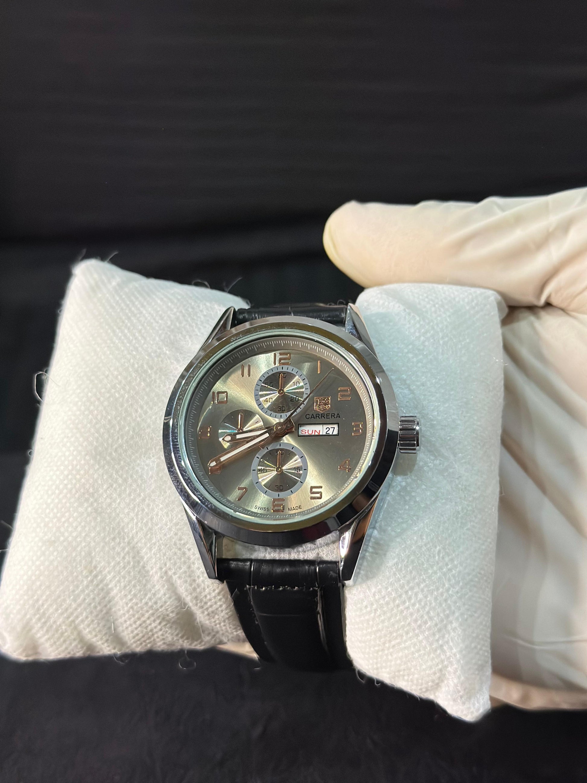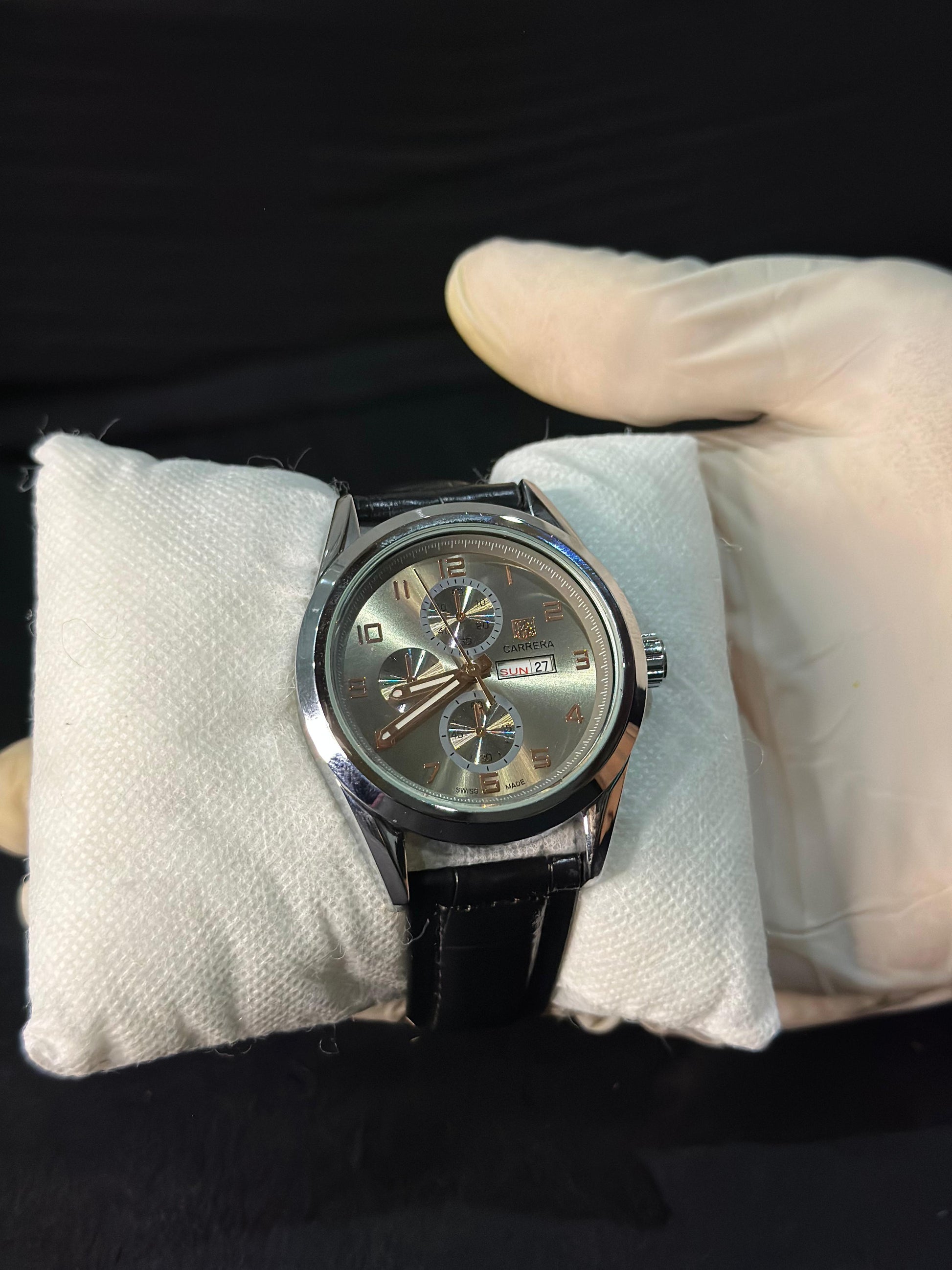 Where craftsmanship meets character — the TAG Heuer Carrera Chronograph commands attention with its radiant sunburst dial, polished steel casing, and rich black leather strap. Designed for those who value performance as much as presence, it’s a statement of refined strength and enduring sophistication.